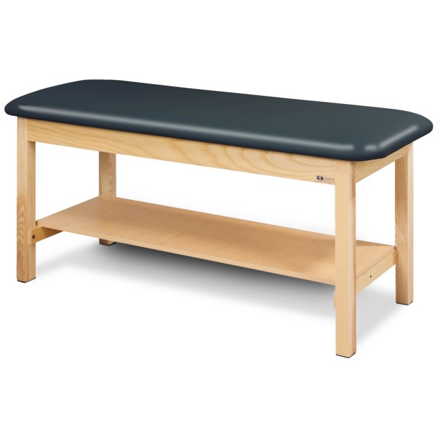 200-27: Clinton Classic 400 Series Flat Top Straight Line Medical Treatment Tables with Hardwood Legs, H-Brace with Shelf, 2" Firm Foam Padding, 400 Pounds Load Capacity, 72" L x 27" W x 33" H, Choice of 9 Vinyl Upholstery Colors and 2 Wood Finishes.