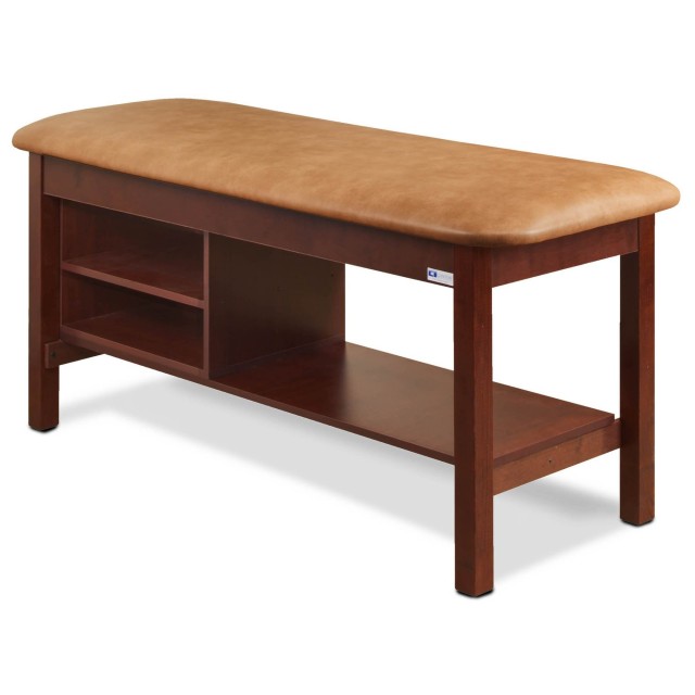 300-27: Clinton Classic 400 Series Flat Top Straight Line Medical Treatment Tables with Hardwood Legs, H-Brace with Shelf and Tiered Shelves, 2" Firm Foam Padding, 400 Pounds Load Capacity, 72" L x 27" W x 33" H, Choice of 9 Vinyl Upholstery Colors and 2 Wood Finishes.