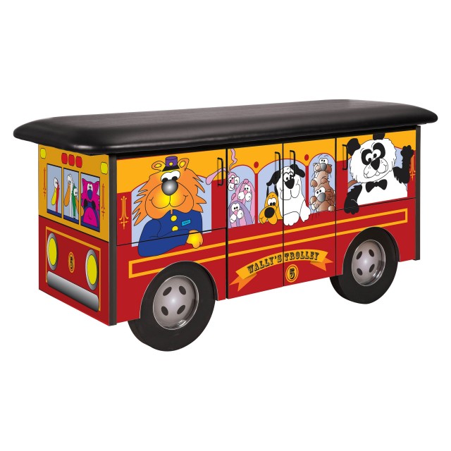 7080: Clinton 7080 Fun Series Wally's Trolley Pediatric Exam Room Treatment Tables, 3 Doors with Storage Compartments (1 Shelf Each), 72" L x 27" W x 34” H with Black Vinyl Upholstery.