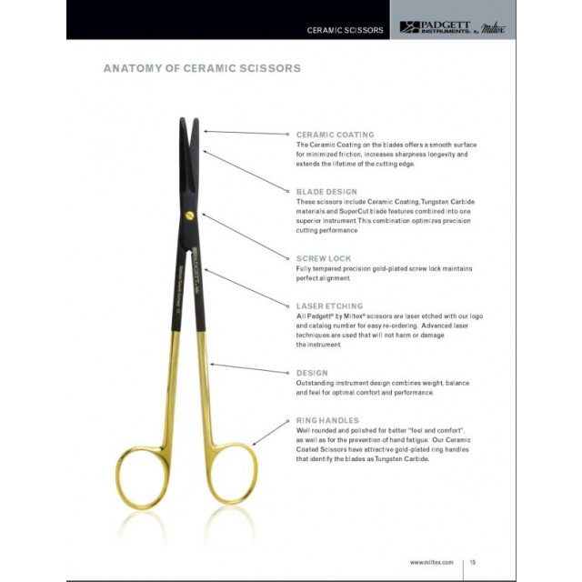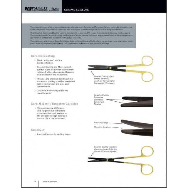 Description:These “Surgeons State of the Art” Scissors offer an innovative design with Ceramic and Tungsten Carbide materials for maximizing surface hardness and durability combined with Padgett’s SuperCut blade design for superior cutting performance.