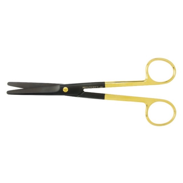 PM-5SC124CTC: Padgett Mayo SuperCut Standard Beveled Blade Scissors with Black Anti-glare Micro Smooth Ceramic Blade Coating, 85 HRC Hardness, Tungsten Carbide Carb-N-Sert and Razor Sharp Cutting Edges with Micro-fine Serrations on Lower Blade, Gold Plated Ring Handles and Hardened Screw Lock to Maintain Perfect Alignment, Straight, Rounded Tip, 6.75” (17.1 cm) Long