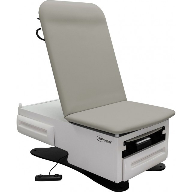 UMF 3001: FusionONE Power Exam Table, Power High-Low, Manual Back, Foot Control, Large Front Drawer and Reversible Side Drawer, NO Stirrups, Pull Out Padded Leg Extension, Table Paper Holder, Drain Pan, Heavy Galvanized Steel Construction, 500 Pounds Patient Weight Capacity, ADA Accessible Raises 19” to 32” H and Removable Seamless Top in Choice of 16 Vinyl Upholstery Colors with Prefixx Protective Finish.