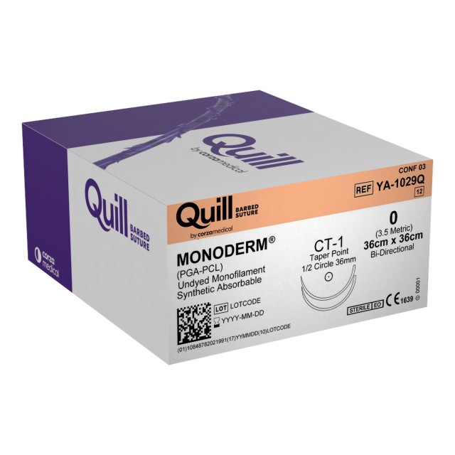 Quill barbed knotless Monoderm bi-directional suture lengths available from 3.5cm x 3.5cm up to 45cm x 45cm, sizes from 5-0 to 0 and Precision Fine Reverse Cutting, Reverse Cutting, Taper Point and Straight Cutting Needles.