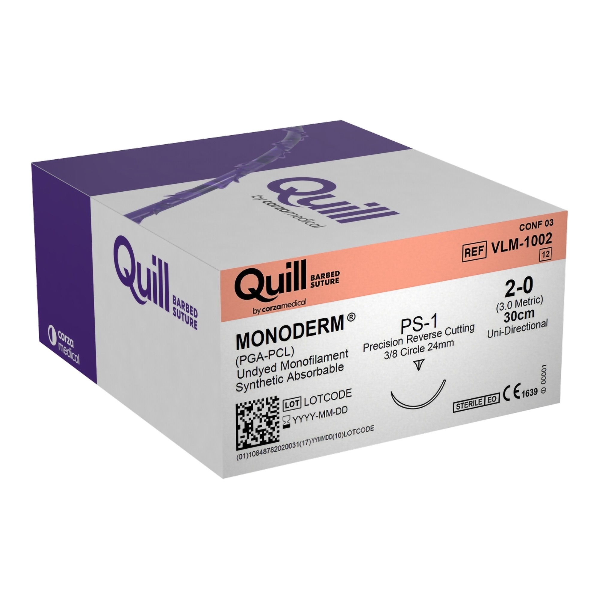 VLM-1002: QUILL Barbed 2-0, 30cm Long, Uni-directional Monoderm / Undyed Absorbable Monofilament (PGA-PCL) Knotless Suture with Adjustable Loop, Single Arm PS-1 Fine Precision Reverse Cutting Needle (24 mm Long, 3/8 Circle Curvature), Box of 12