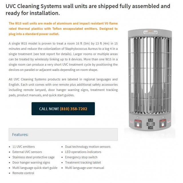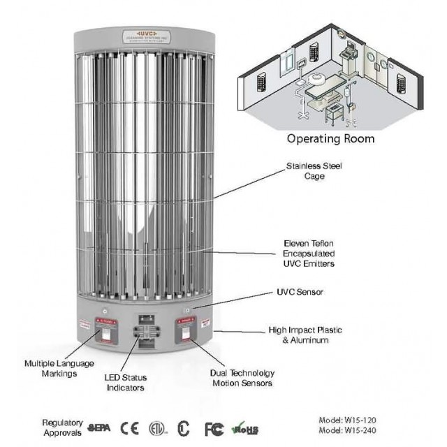 Germicidal Ultraviolet C Disinfection is a proven technology to enhance your infection prevention protocol. There is ZERO tolerance when eliminating harmful bactera, viruses and fungi effecting your staff and clients. Current manual cleaning processes alone are insufficient at reducing the biological burden within your facility. Germicidal Ultraviolet C (UVC) disinfection treatments add a second layer of assurance to your environmental service operations. The UVC emitters utlize amalgam tehnology and are Teflon encapsulated. The dual motion sensing technology creates a safe operating environment by preventing accidental UVC exposure.
